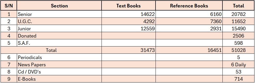 As on 31st May 2025, the Library at Kumarswami College maintains a comprehensive and well-organized collection of books to support the academic and research needs of students and faculty. The collection includes books from a wide range of disciplines and categories.
